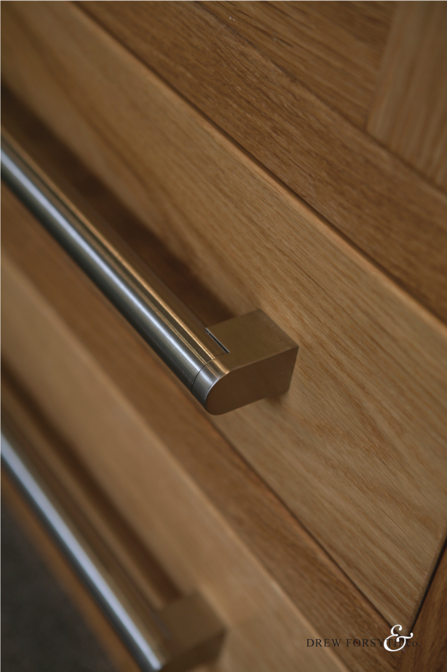 This sleek L-shape designed kitchen is made of solid oak. The built-in spotlights create a modern and stylish design.