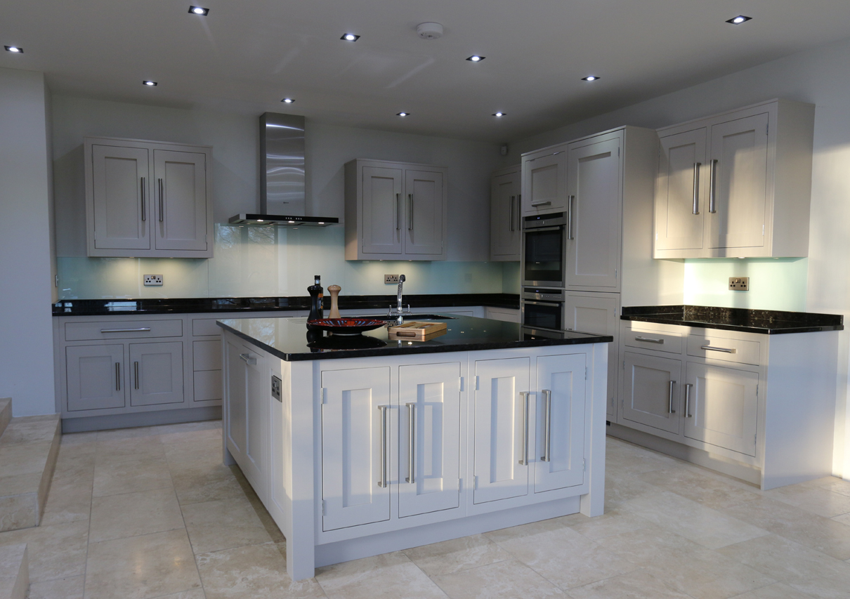 Symetrical clean lines and stylish glass splashbacks and dark granite worktops give this kitchen a modern twist.