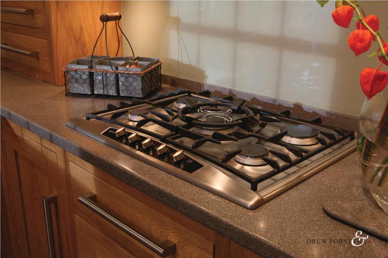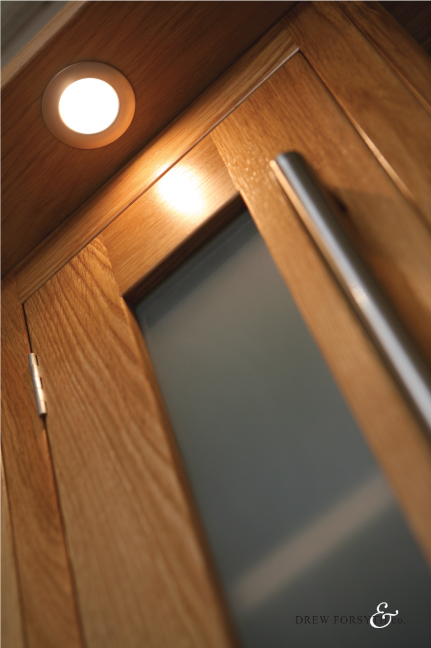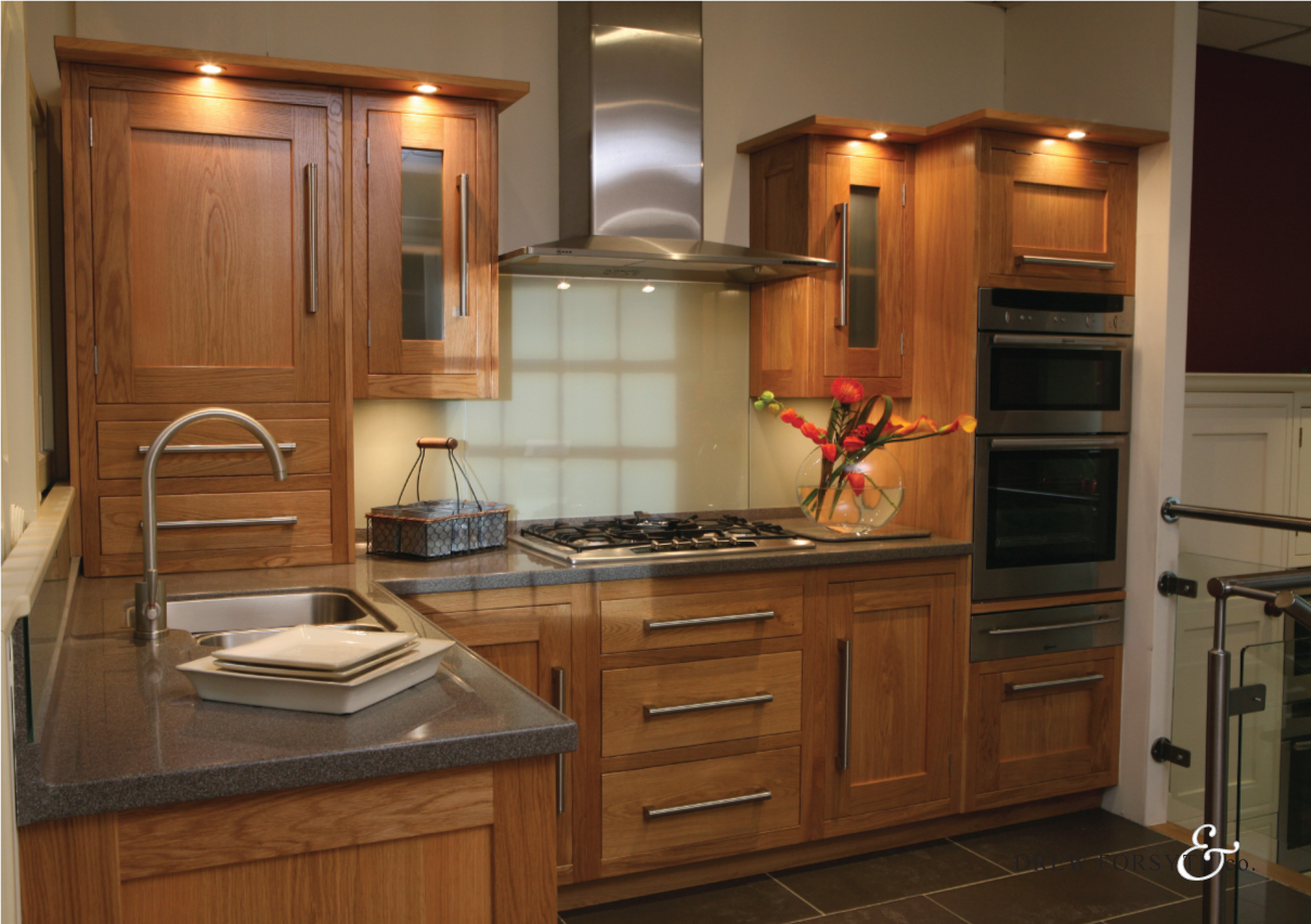 This sleek L-shape designed kitchen is made of solid oak. The built-in spotlights create a modern and stylish design.