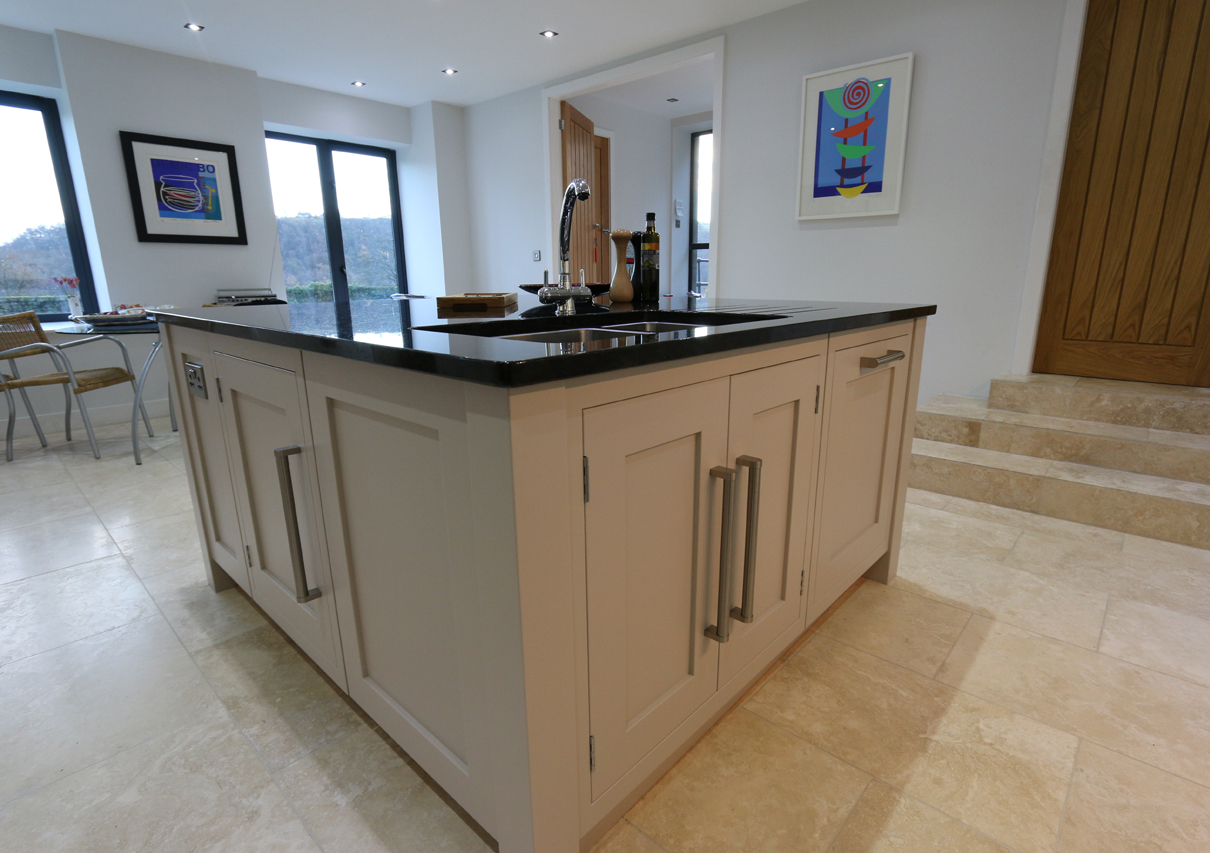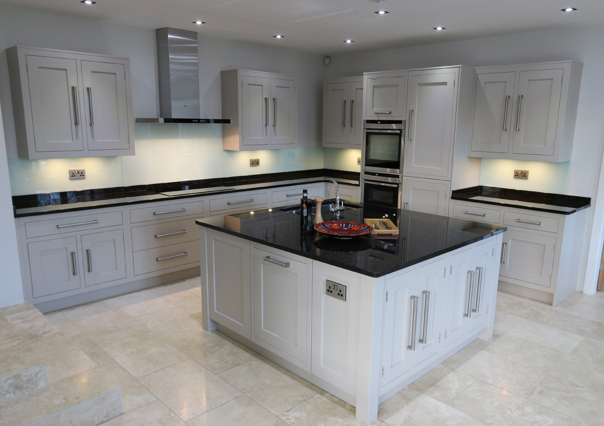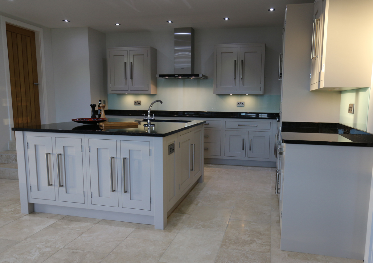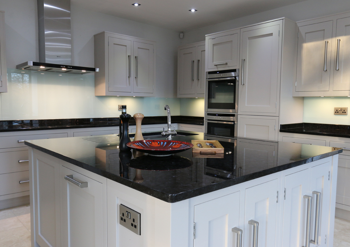 Symetrical clean lines and stylish glass splashbacks and dark granite worktops give this kitchen a modern twist.